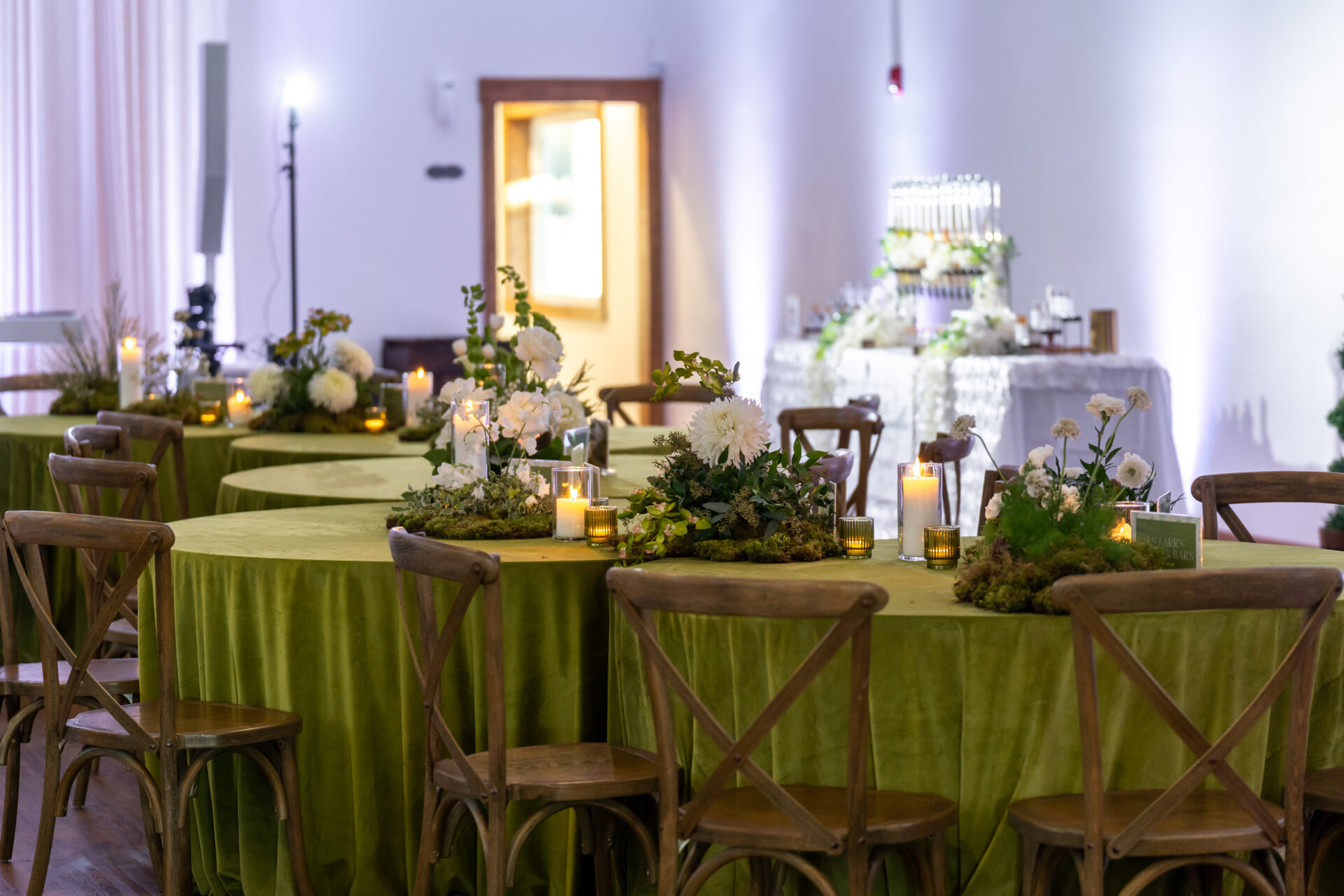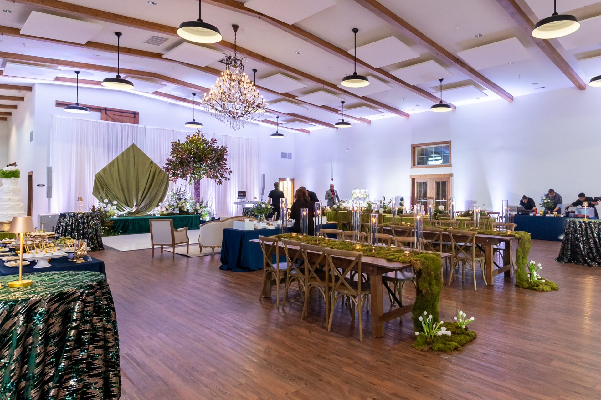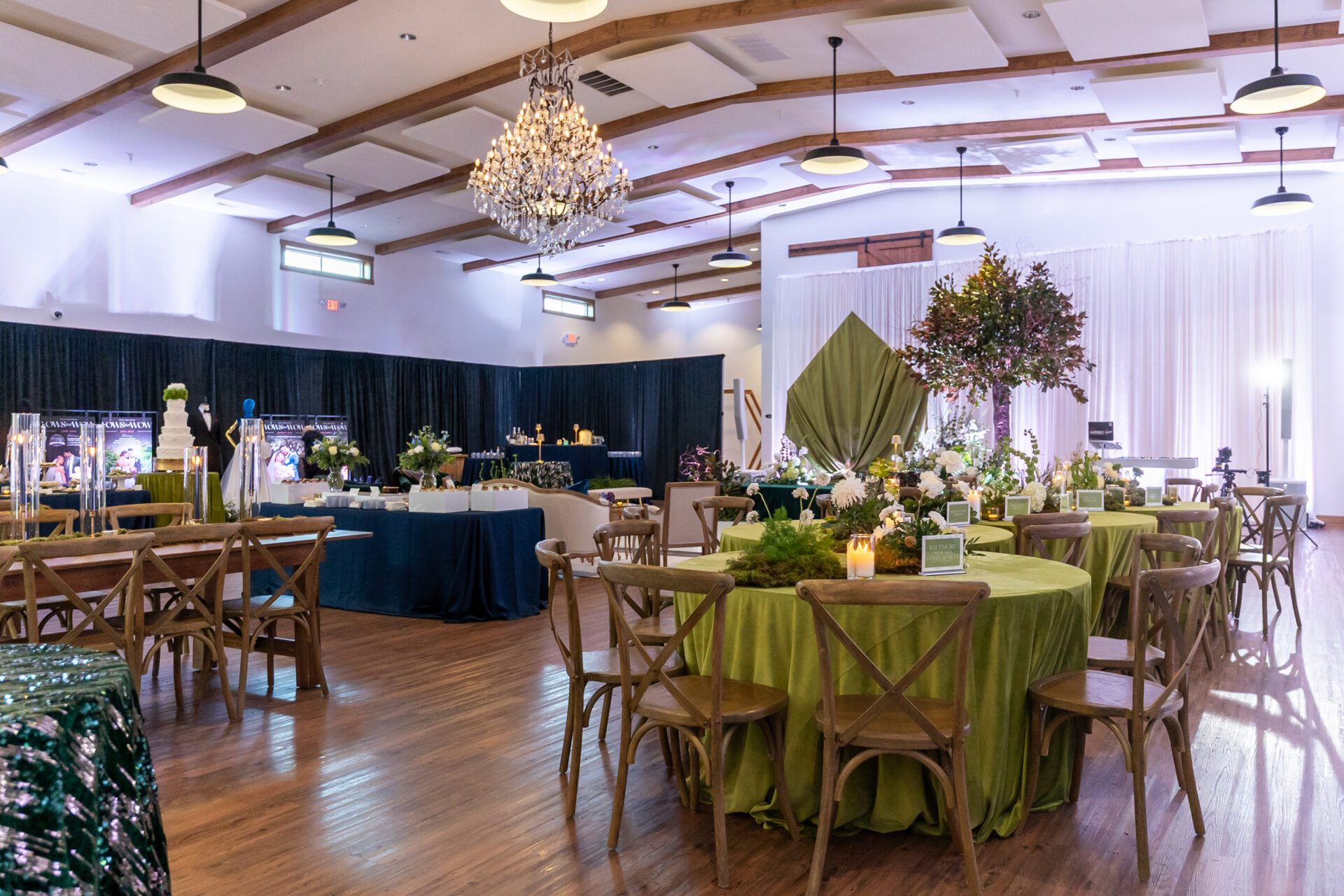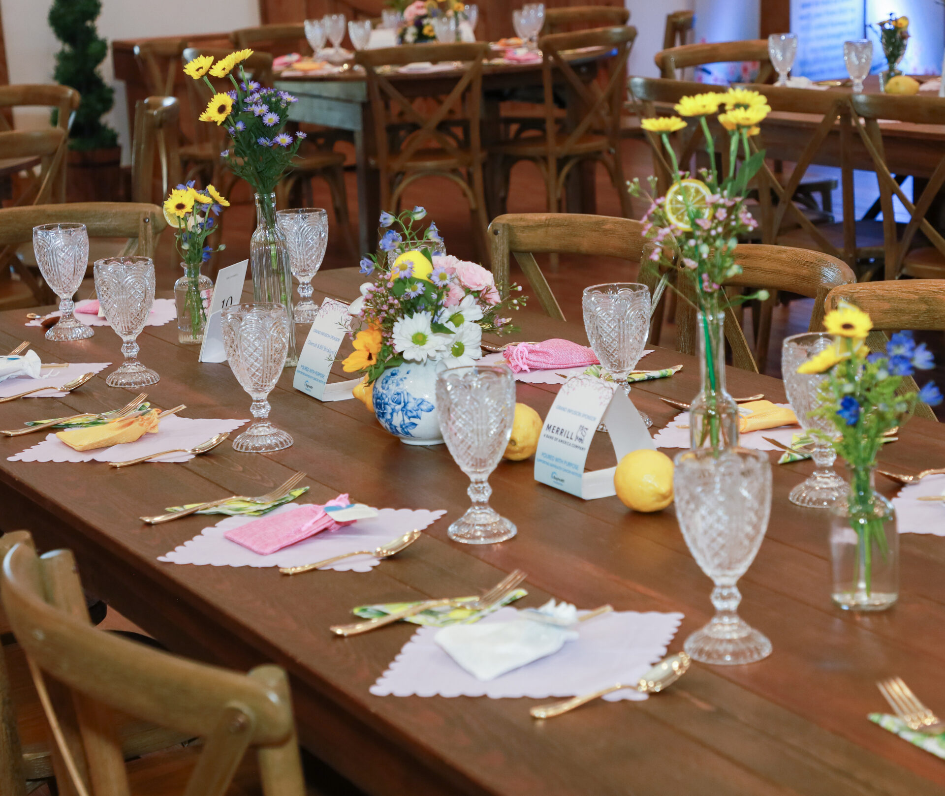 - Quality furniture is included for custom seating arrangements and layouts. 250 cross-back chairs and 30 farm tables for a high-end, cohesive look.